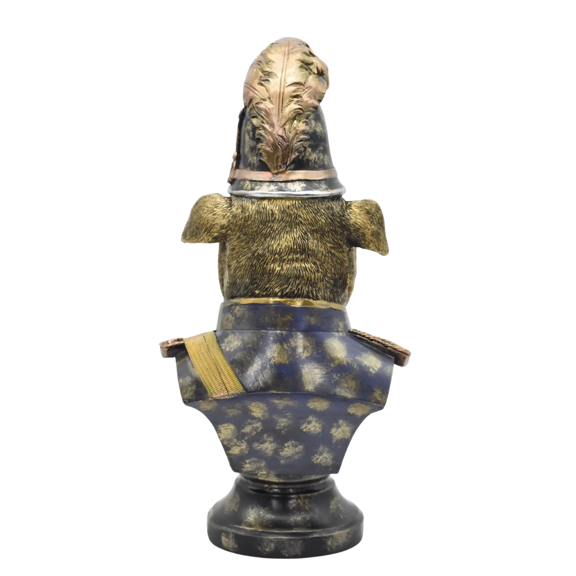 Hundeliebhaber aufgepasst: So gehorsam ist kein anderes Tier! Diese Büste einer leicht melancholisch dreinblickenden Bulldogge besticht durch ihren realistischen Ausdruck. Eine goldfarbene Schärpe voller Details zieht sich über die Schulter. Besonders beeindruckend ist die detailreiche Darstellung der Federn und des Fells.