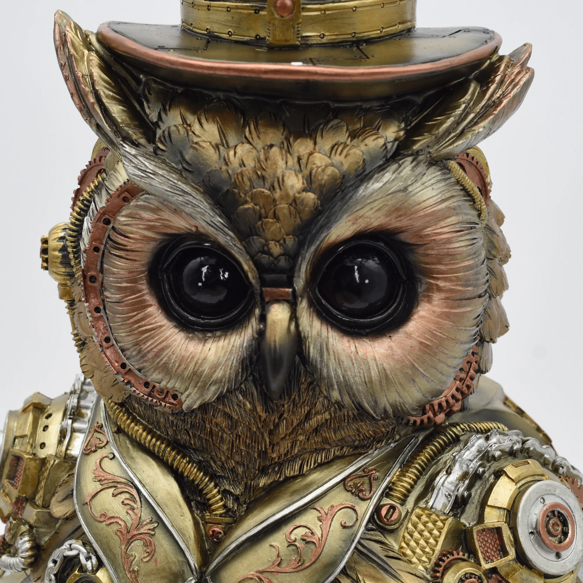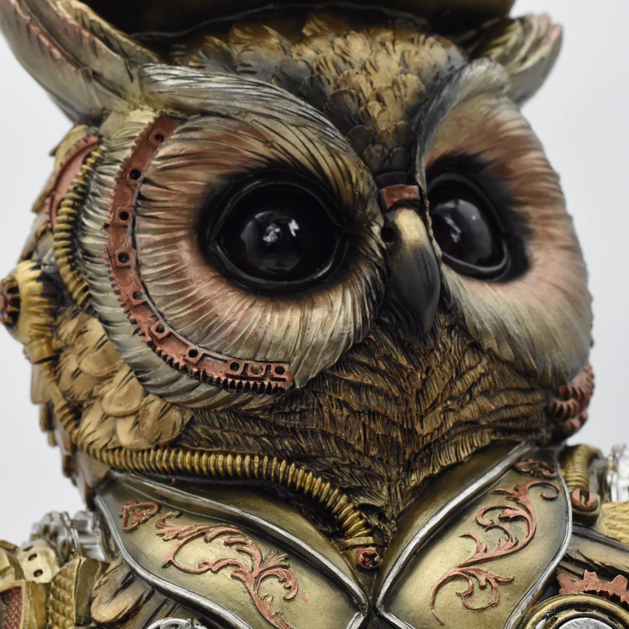 Diese aufmerksame Eule hat ganz besonders wache Augen. Die schwarzen Kugeln stehen in einem schönen Kontrast zu den goldenen Federn, die von den Augen wegführen. Sie trägt den Genre typischen Zylinder mit Zahnrädern. Ganz besonders raffiniert am Design ist, wie die Federn teilweise in die Klingen von Messern übergehen.